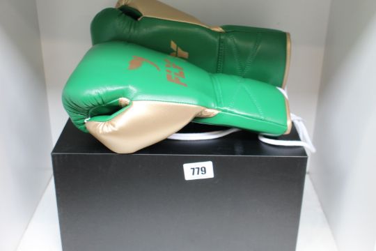A pair of as new Fly superlace x green/gold 12oz boxing gloves.