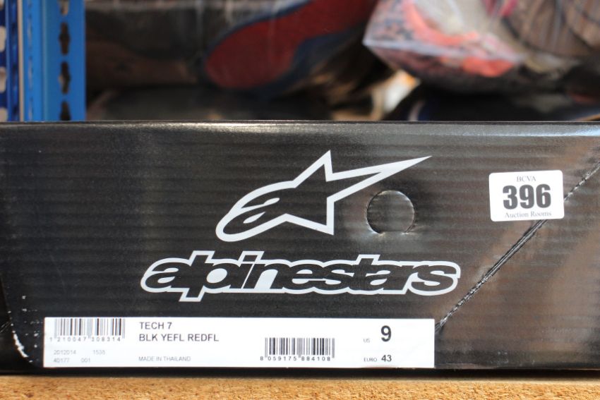 A pair of boxed as new Alpinestars Tech 7 Motocross boots in black, fluorescent red and yellow (US 9).