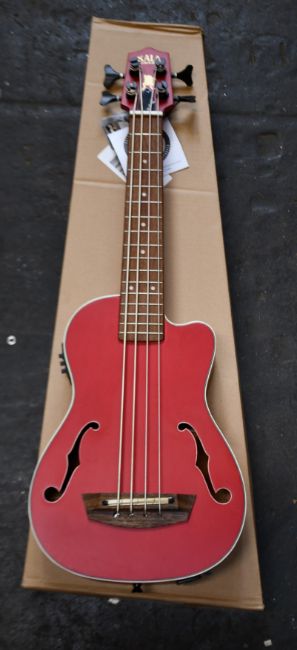 An as new Kala U-Bass Journeman ukulele bass guitar in mahogany matte red.
