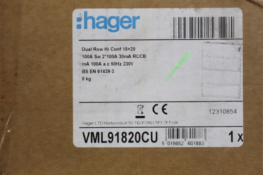 A Hager VML91820CU Dual Row HI Conf 18+20 Way 100A Switch 2*100A RCCB.