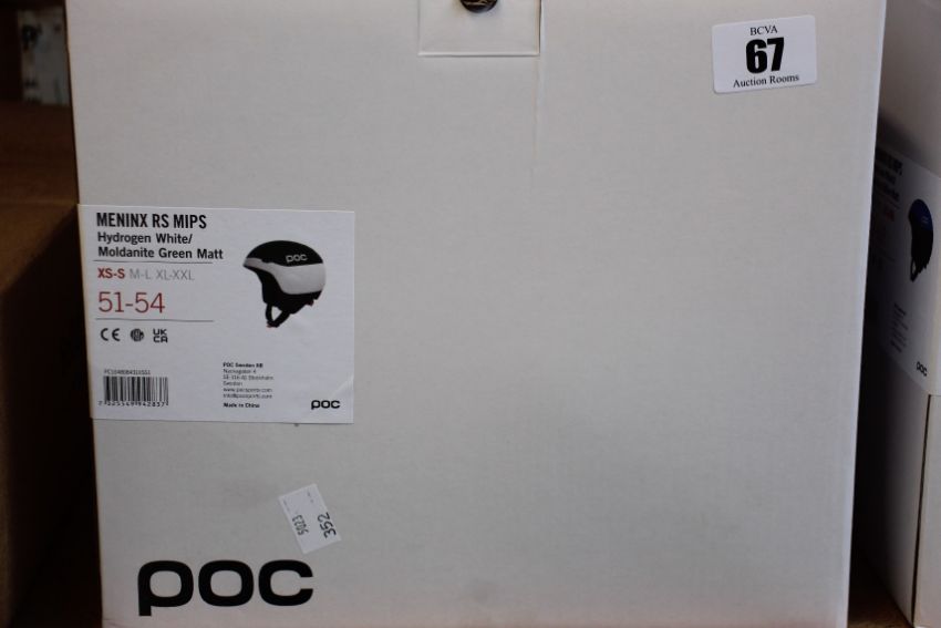 A boxed as new POC Meninx RS MIPS Snow Helmet in Hydrogen White/Moldanite Green Matt (XS-S, 51-54).