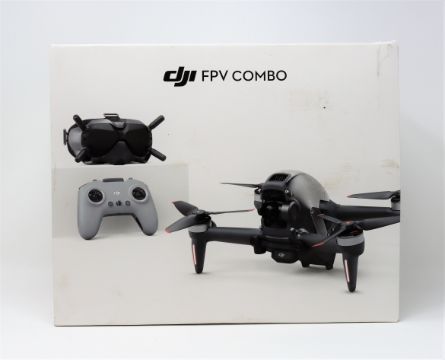 A pre-owned DJI FPV Quadcopter Drone in Black with Goggles V2, Goggles Antenna, Controller, Propellers, UK power adaptor, USB cable, Top Shell, Gimble Protector, Headband (No batteries included) (Boxed) (Untested, sold as seen).