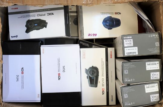 COLLECTION ONLY- FAULTY, SOLD FOR PARTS: A quantity of assorted Sena Motorcycle Bluetooth Communication Systems including models 10C EVO, 10C PRO, 10U, 10S and 10R (Approx. 25 items) (All items retail customer returns, various faults. Sold as seen for parts only).