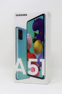 A boxed as new Samsung Galaxy A51 SM-A515F/DSN 128GB in Prism Crush Blue (Box sealed, some damage to box. 2-pin plug included).