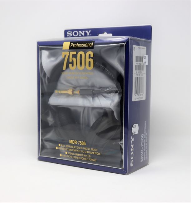 A boxed as new pair of Sony MDR-7506 sound monitor headphones in black.