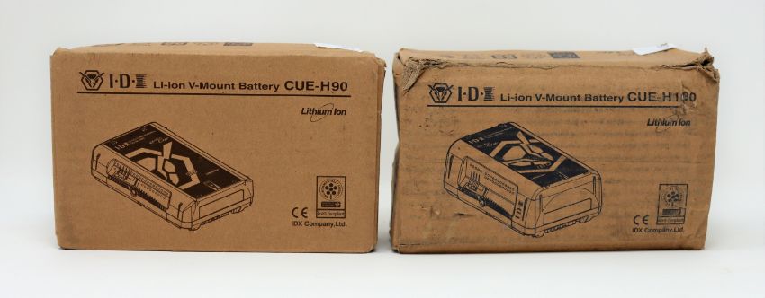A boxed as new IDX System Technology CUE-H180 179Wh Compact Li-Ion V-Mount Battery and a boxed as new IDX System Technology CUE-H90 90Wh Compact Li-Ion V-Mount Battery (Both boxes damaged).