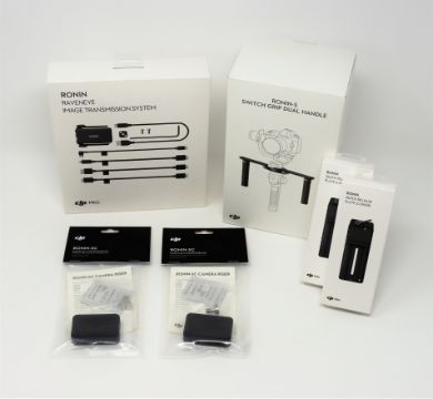 A DJI Ronin-S Switch Grip Dual Handle, a DJI Ronin RavenEye Image Transmission System, two DJI Ronin Quick-Release Plate (Lower) and two DJI Ronin SC Camera Risers (All items new and sealed).