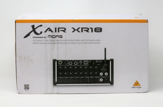 A boxed as new Behringer X AIR XR18 18-Channel 12-Bus Digital Mixer for iPad/Android Tablets (2-pin power cable included) (Box opened, some damage to box).