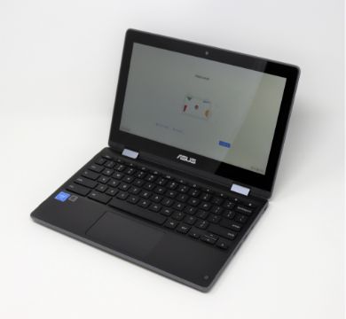 A pre-owned boxed Asus Flip C214M 11.6" Chromebook laptop with Intel Celeron N4020 CPU, 4GB RAM and 32GB eMMC storage in dark grey.
