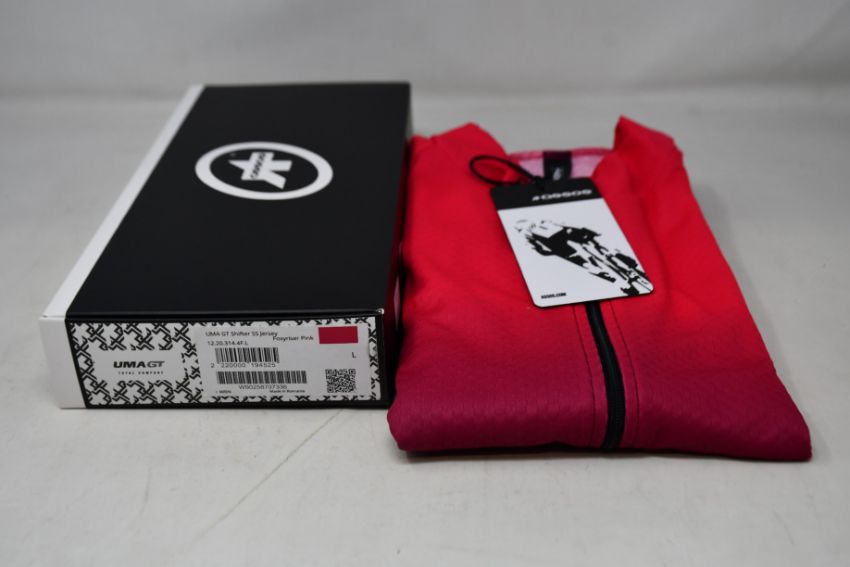 An as new Assos Uma GT C2 Shifter short sleeve cycling jersey in foxyriser pink (L).