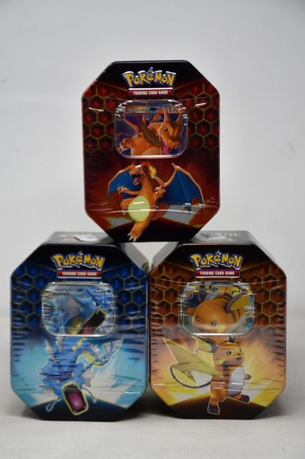 Three sealed as new Pokemon Hidden Fates tins (Complete tin set).