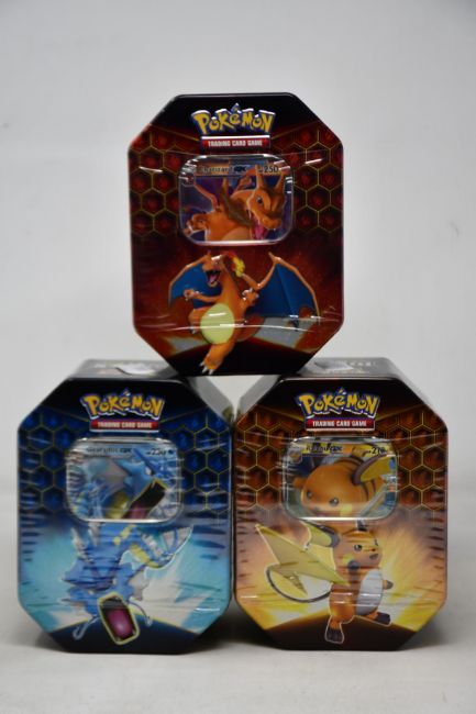 Three sealed as new Pokemon Hidden Fates tins (Complete tin set).