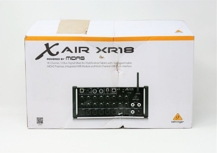 A boxed as new Behringer X AIR XR18 18-Channel 12-Bus Digital Mixer for iPad/Android Tablets (2-pin power cable included) (Box opened, damaged box).