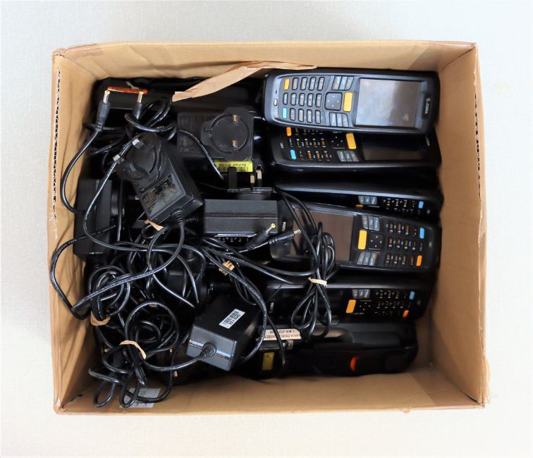 Twelve pre-owned Zebra MC2100 Mobile Handheld Computer Barcode Scanners with UK Power Supplies (Sold for spares/repair. Zebra Retail Inventory Software installed, password locked. Resetting required).