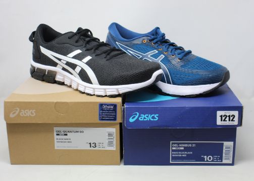 Two pairs of men's as new Asics trainers; Gel-Nimbus 21 (UK 9) and Gel-Quantum 90 (UK 12).