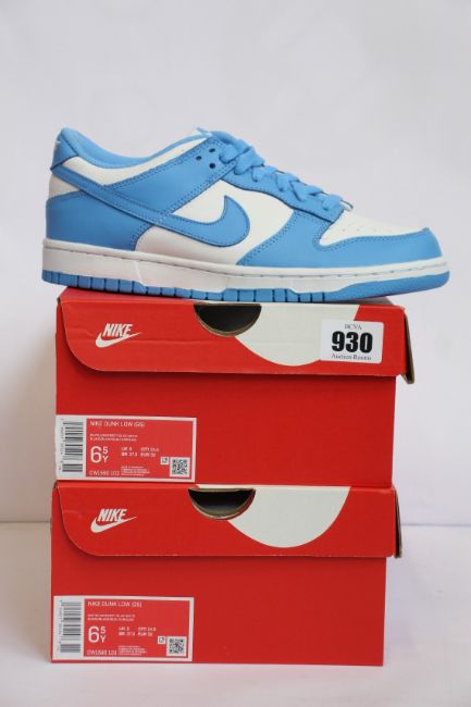 Two pairs of youths as new Nike Dunk Low GS (UK 6).