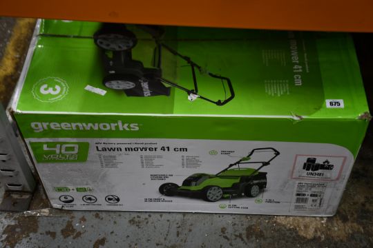 A Greenworks G40LM41 40 Volt Battery Powered Lawnmower.