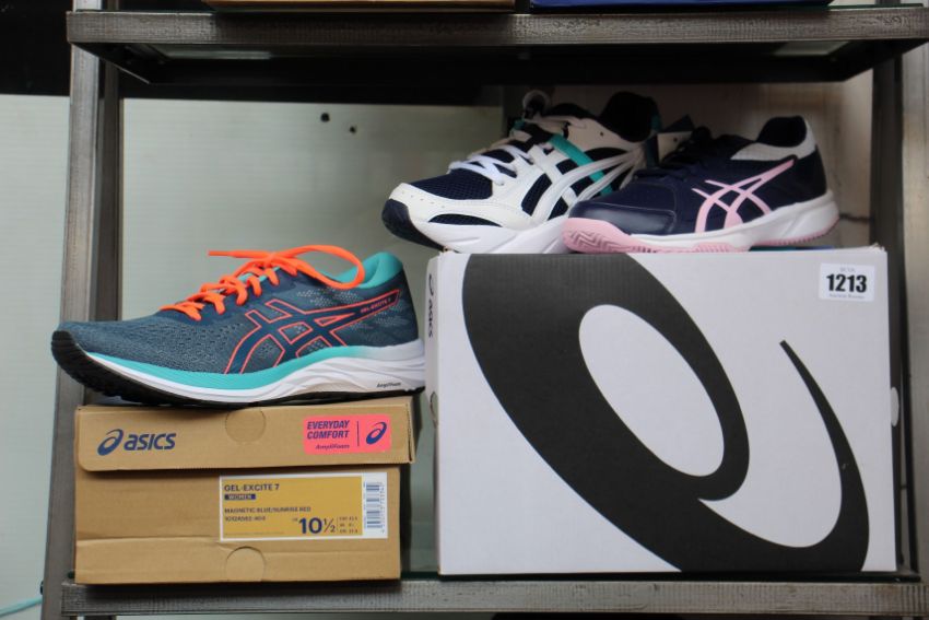 Four pairs of women's as new Asics trainers; Gen-BND (UK 5.5), Gel-Excite 7 (UK 8.5) and two pairs of Court Slide Clay (UK 4, 7.5).