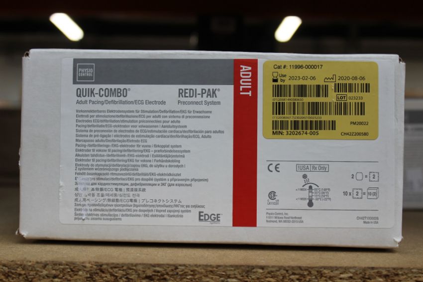 One box of ten Physio Control Quick-Combo, Red-Pak Adult ECG Pacing/Defibrillation/ECG Electrodes.