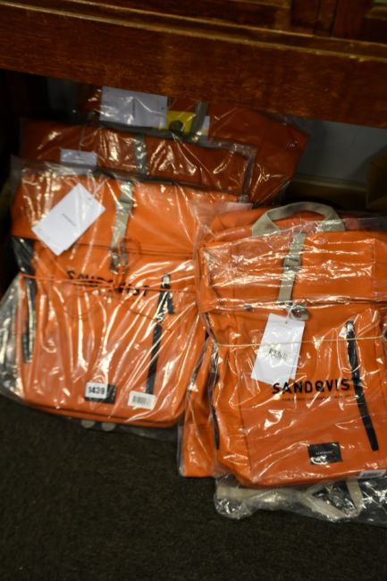 Six as new Sandqvist Dante Vegan backpacks in burnt orange.
