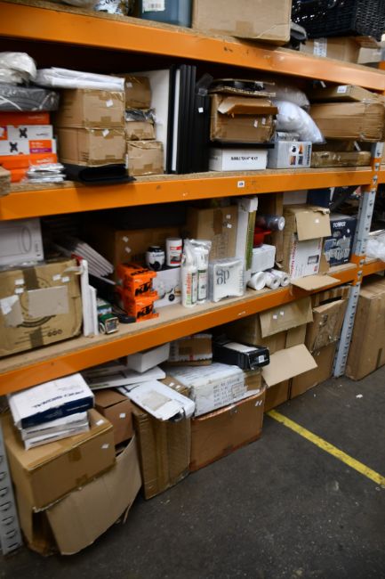 A large quantity of household related items to include a Morphy Richards Chroma Sensor Bin, a Tower Infinity Stone Microwave and other kitchen accessories, bedding and TV/monitor wall mounts.