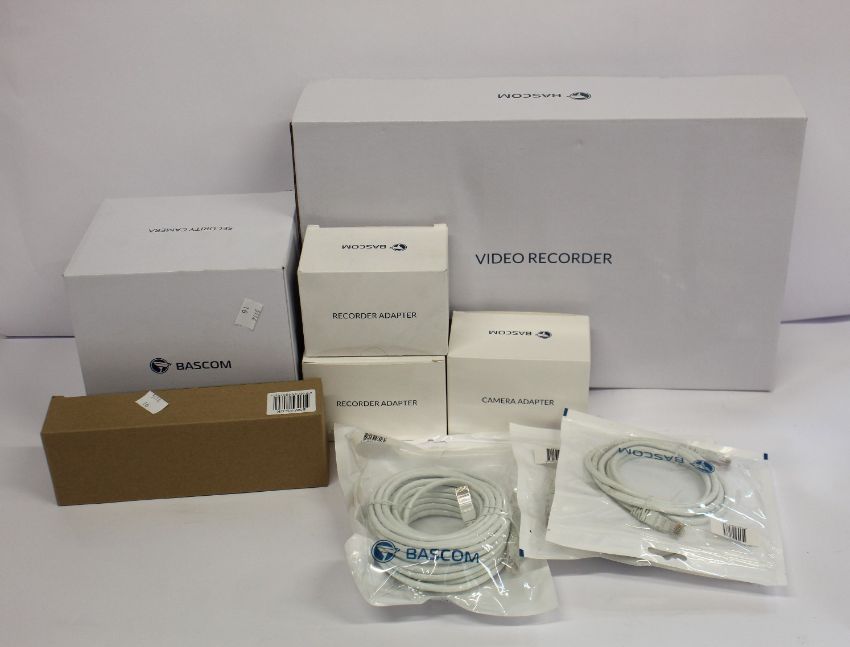A quantity of as new Bascom products to include: a Bascom camera Plus (XD50S-B), a 4-channel recorder (R4X), UTP cables for the camera and recorder, Powerline adapters for the camera and recorder and a power supply.