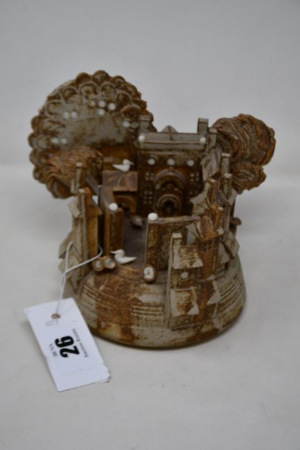 Paul Gandy (England b.1930), studio pottery sculpture depicting a town, circa 1980, decorated with porcelain birds and marked with artist's name underneath.
