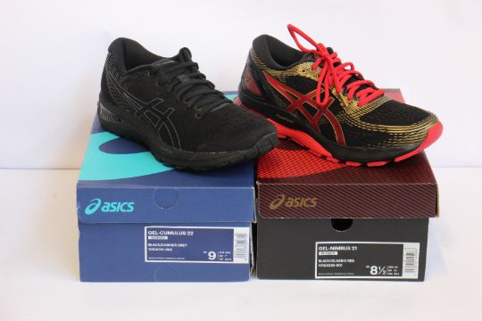 Two pairs of women's as new Asics trainers; Gel-Cumulus 22 (UK 7) and Gel-Nimbus 21 (UK 6.5).