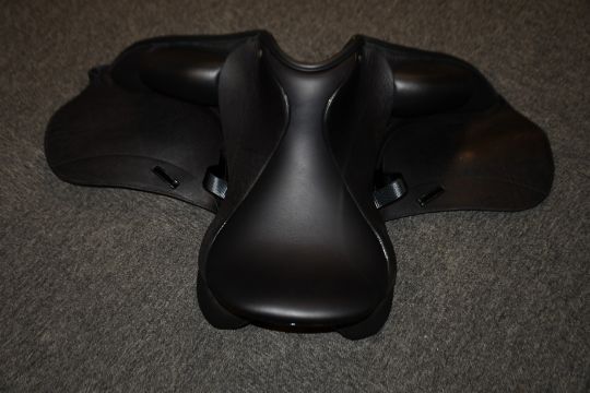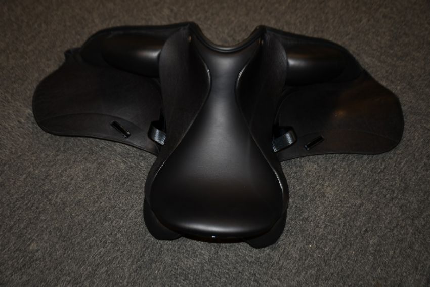 A Custom Saddlery Wolfgang Omni Monoflap dressage saddle: Size 17, Tree size 26.5 (List of features with details on options, seat, cantle, flaps and panel).