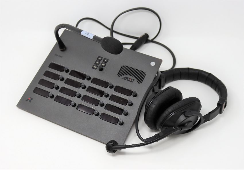 A pre-owned Riedel DCP-1016E/O 16 Key Desktop Control Panel, a pre-owned Riedel MIC-30 Gooseneck Microphone and a pre-owned Riedel PRO-D2 XLR4F Headset (All items untested, sold as seen).