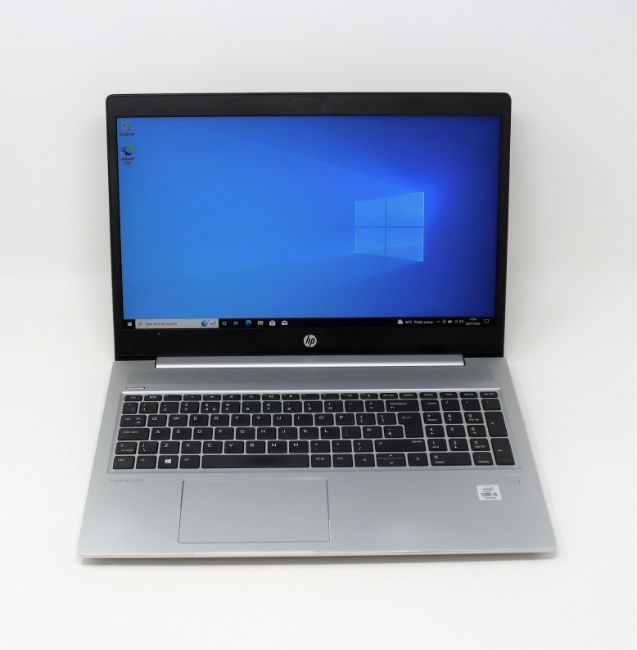 A pre-owned HP ProBook 450 G7 laptop with a 15.6" FHD display, Intel Core i5-10210U CPU, 8GB RAM and 256GB SSD in silver.