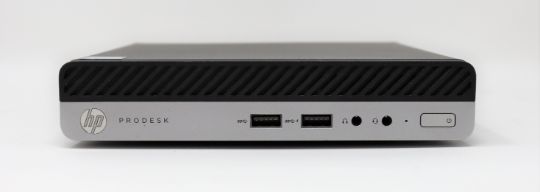 A boxed pre-owned boxed HP ProDesk 400 G5 mini desktop PC with Intel Core i5-9500T CPU, 8GB RAM and 256GB SSD in black (power supply included).