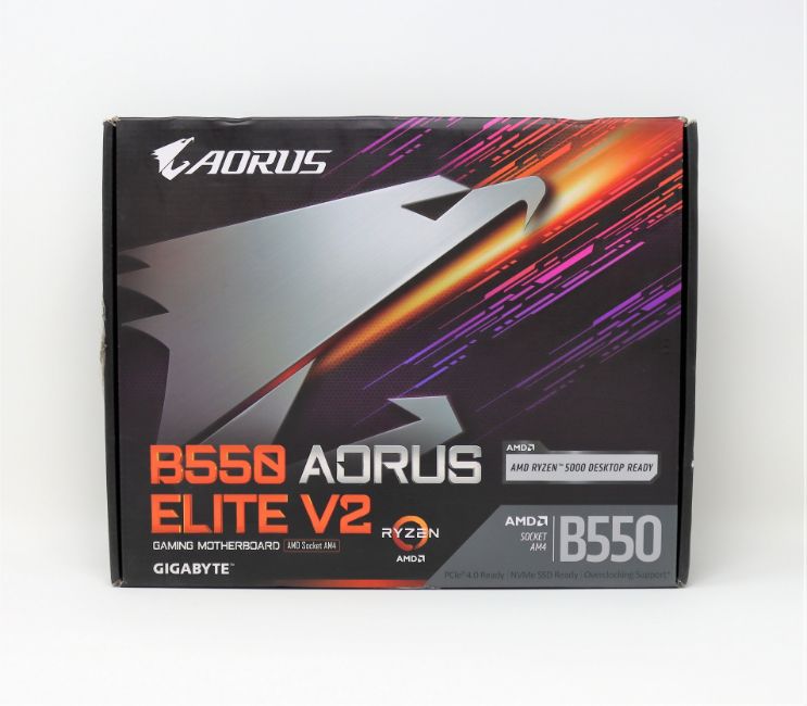 A boxed as new Gigabyte B550 Aorus Elite V2 gaming motherboard for AMD socket AM4 (ATX form factor) (box opened).