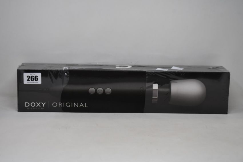 A boxed as new Doxy plug-in vibrating wand massager - black.