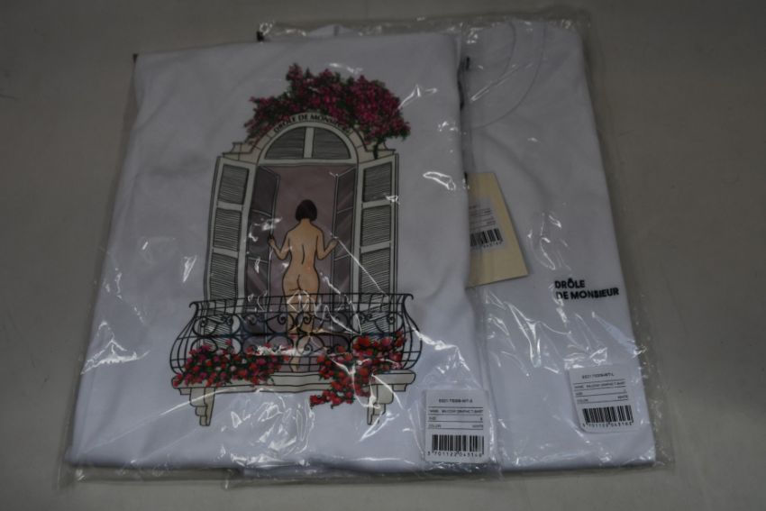 Two as new Drole De Monsieur Balcony Graphic T-shirts in white (M).