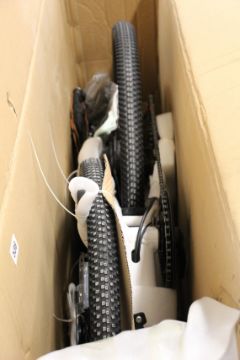 A boxed AKEZ electric bike with basket and kick-stand (Model unknown, box damaged, viewing advised).