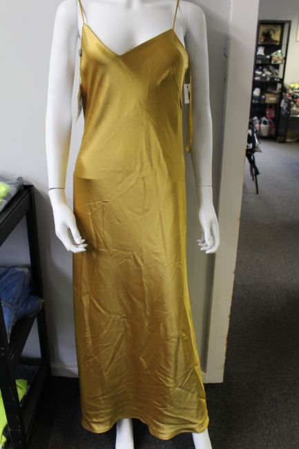 An as new Galvan London satin V neck midi slip in mustard (Size 38).