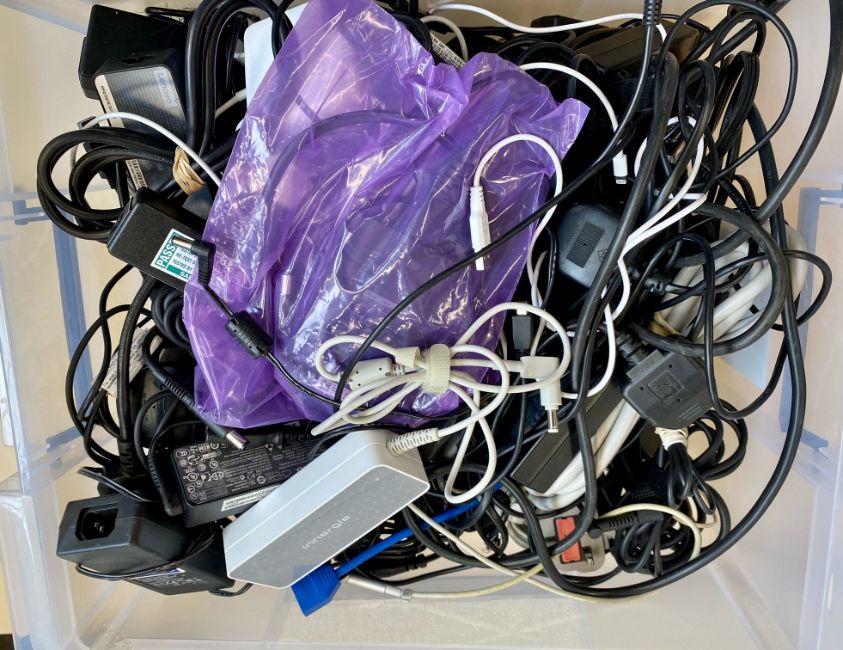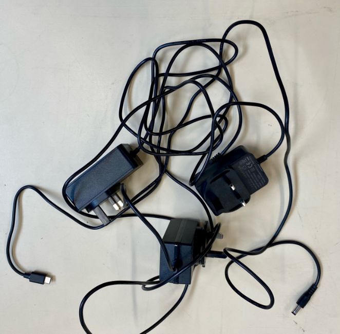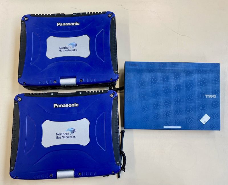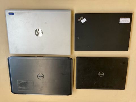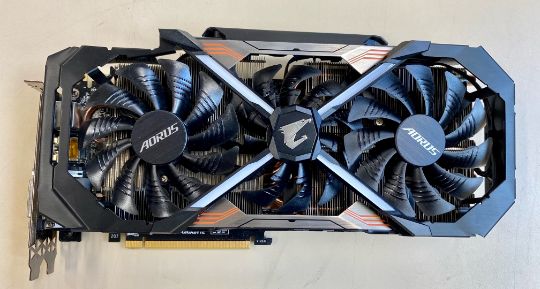COLLECTION ONLY: A quantity of assorted pre-owned laptops sold for parts (Most with drives removed, some faulty/damaged/bios locked), a pre-owned Aorus graphics card (Sold for parts) and a quantity of assorted pre-owned laptop power supplies (All items sold as seen, viewing advised).