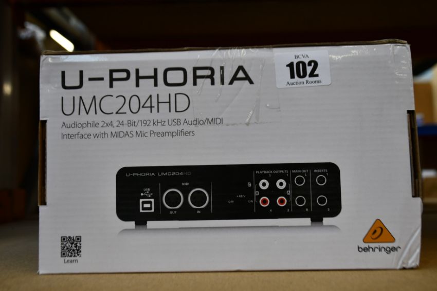 Two boxed as new Behringer U-Phoria UMC204HD mic preamplifiers.