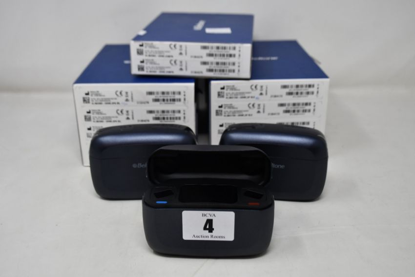 Three pairs of Beltone hearing aids and five charging cases (PN: HI IMG963, HI IMG1763 and HI IMG663).