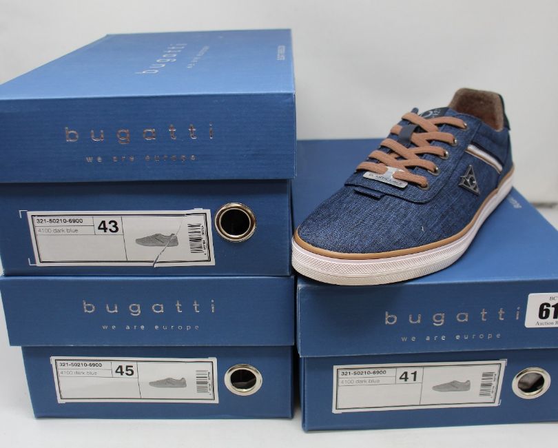 Three pairs of as new Bugatti 321-50210-6900 1200 trainers in dark blue (EU 41, 43, 45).