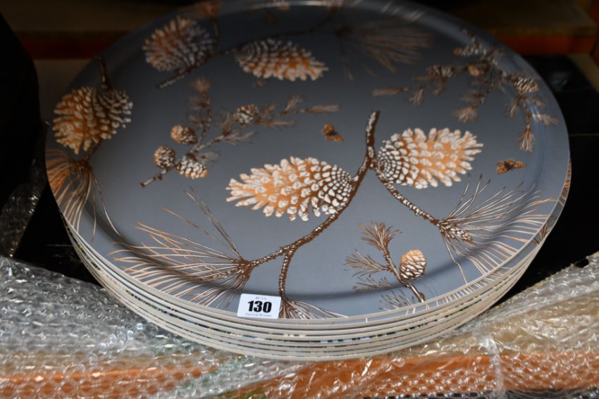 Four as new AryHome Pine Cone "Moss Grey" Trays by Sam Pickard (65cm diameter) and four as new AryHome "Strawberry Thief" Trays by The V&A Museum (65cm diameter).