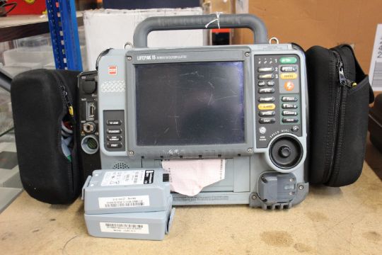 A pre-owned Lifepak 15 Monitor/Defibrillator with wires, accessories and two Li-ion rechargeable batteries (Monitor/Defibrillator - MFG: 2016-03-18, REF: 99577-001388, PN: V15-5-000013, Batteries REF: 21330-001176, PN: 3206735-003) (NOTE: Item has not been tested, viewing is advised).