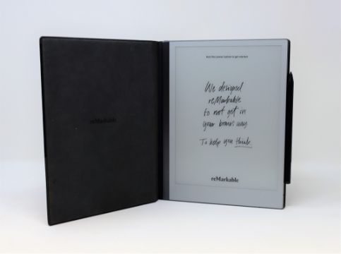 A pre-owned reMarkable 2 Paper Tablet with a Marker Plus Stylus and Book Folio in Grey Fabric.