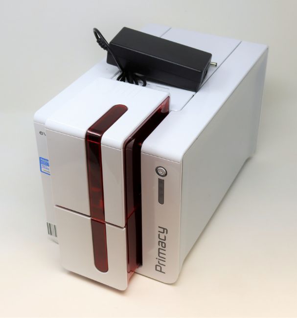 A pre-owned Evolis Primacy ID Card Printer (PSU and sample cards included) (Tested, working)..