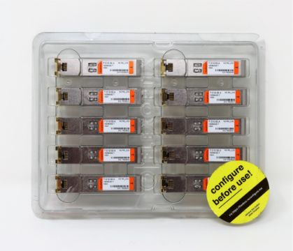 Ten as new Flexoptix 1000BASE-T 100m Copper SFP Universal Transceivers (Some damage to packaging).