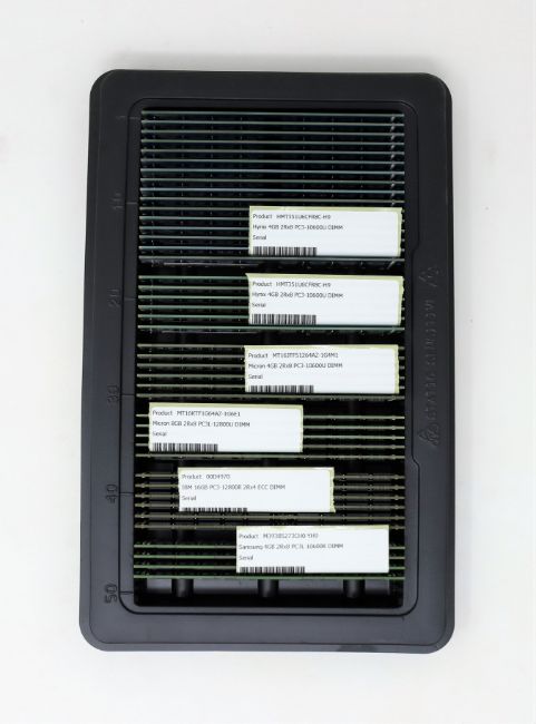 A quantity of pre-owned memory modules to include; 16 x Hynix HMT351U6CFR8C-H9 4GB PC3-10600U DDR3, 6 x Hynix HMT351U6CFR8C-H9 4GB PC3-10600U DDR3, 6 x Micron MT16JTF51264AZ-1G6M1 4GB PC3-12800 DDR3, 6 x IBM 00D4970 16GB PC3-12800U DDR3 and Samsung M393B5273CH0-YH9 4GB PC3-10600 DDR3 (All untested, sold as seen).