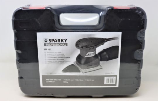 An as new Sparky professional sander (MP251) and two packs of Sparky sanding papers.