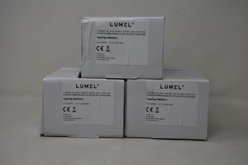Three boxed as new Lumel Din Rail Electric Energy Meters (NMID30-2).