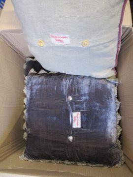 Five Susie Watson Designs Cushions: Four Velvet (2 olive, 2 purple/grey) and one Embroidered Pheasant Linen.